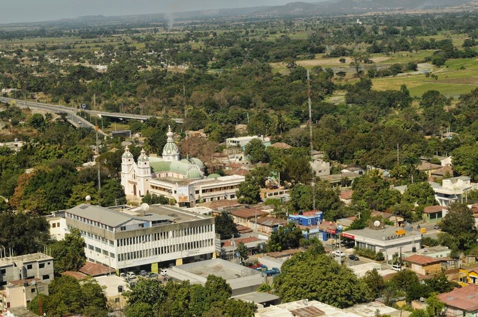 Aparece en primer plano el edificio Ramírez. Al fondo la Catedral San Juan Butista y el puente sobre el rio San Juan en el antiguo barrio Los Montes de Oca, destruído en 1998 por el Huracán Georges. (Foto facebook Eduardo Dauhajre).