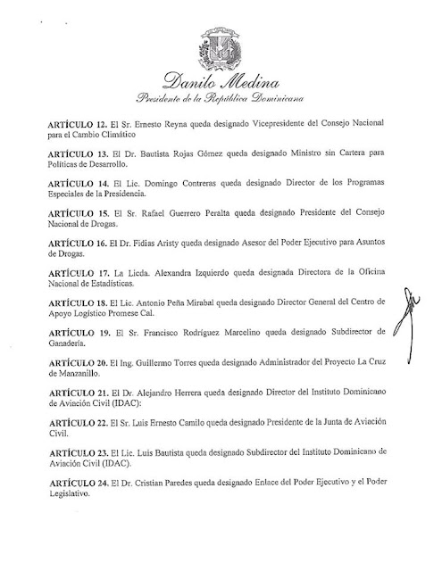 El Presidente Danilo Medina emitió esta noche un decreto en cuial realiza 44 nombramientos de nuevos funcionarios; entre los que se incluyen remociones, así como la puesta en funcionaiento de entidades nuevas, pero que no estaban operando. Las nuevas designaciones son seguidas con mucho interés por parte del pueblo dominicano.