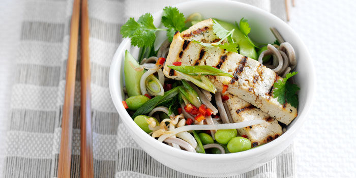 tallarines de Soba y ensalada de frijoles de soya con tofu a la plancha
