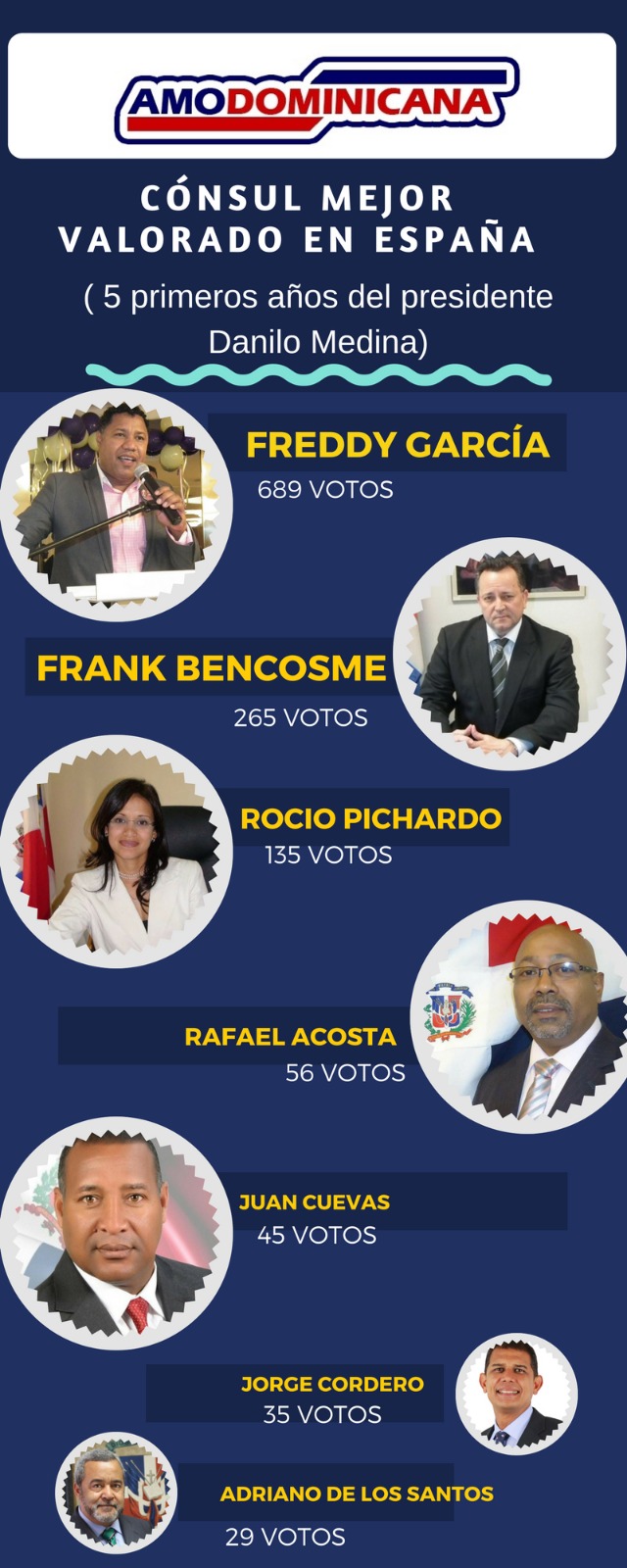 La encuesta realizada del día 10 al 14 de agosto, en todo el territorio español, medió el apoyo a los dominicano, aceptación y popularidad de los actuales cónsules y ex-consules de Madrid, Barcelona y Valencia en los 5 años de Gobierno del presidente Danilo Medina.