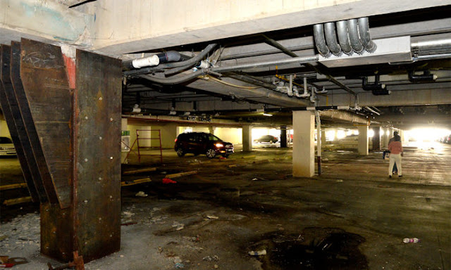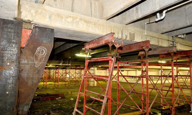 Totalmente desocupado estaba el primer piso, donde se forman charcos de agua por las filtraciones de las visibles tuberías instaladas en el primer y segundo sótano. En este lugar, los andamios sostienen 6 vigas.