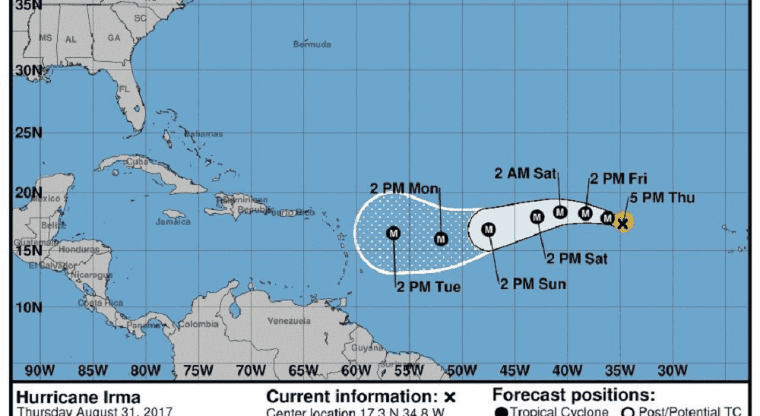 Irma se ubicaba anoche a unos 2,865 kilómetros al este de las Antillas Menores, con vientos máximos sostenidos de 185 kilómetros por hora y moviéndose hacia el oeste/noroeste a unos 19 kilómetros por hora.