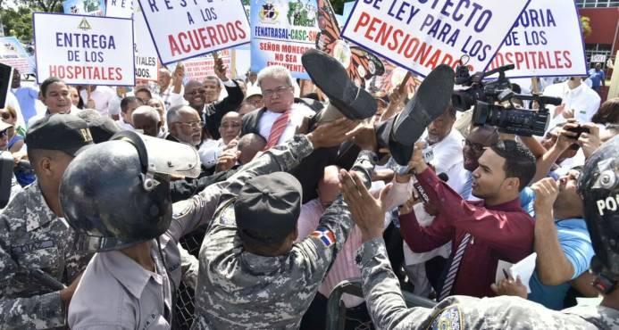 Al llegar a la sede de la institución pública, un grupo de facultativos cargó al presidente del Colegio Médico, Waldo Ariel Suero, para intentar cruzarlo sobre la valla, lo que los policías impidieron y provocaron que éste casi cayera al pavimento.