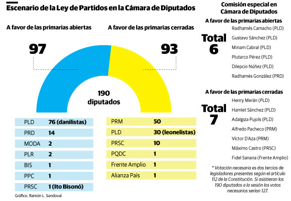 En el bloque de los diputados que apoyan las primarias cerradas están unos 30 del sector leonelista del PLD, 50 del Partido Revolucionario Moderno (PRM), 10 del PRSC, uno del Partido Quisqueyano Demócrata Cristiano (PQDC), uno del Frente Amplio y uno de Alianza País.