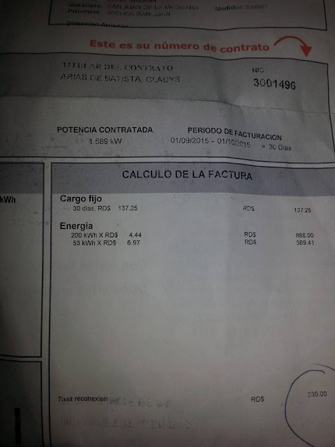 «tenia mas de un año sin recibir una factura de luz y eso que fui a la oficina principal a reclamar me ocupo de pagar el servicio antes del dia 3 de cada mes, por casualidad llego esta factura y me dio por revisar veo k me esran cobrando $330.pesos de reconeccion busco mi ultimo recibo y la fecha de pago fue el 29, cuando fui a reclamar me dicen que esa reconeccion es vieja y le digo que porque no salio en otra factura y la repuesta es que no dio tiempo. para mi es que todo es un maldito robo combinado con la empresa de reconeccion y la de lectura sabra Dios cuantas veces lo han hecho y como no recibia la factura fisicamente no me daba cuenta. Dios mio que maldito pais.sin doliente nos gastamos. los pobres simplemente nos JODIMOS».