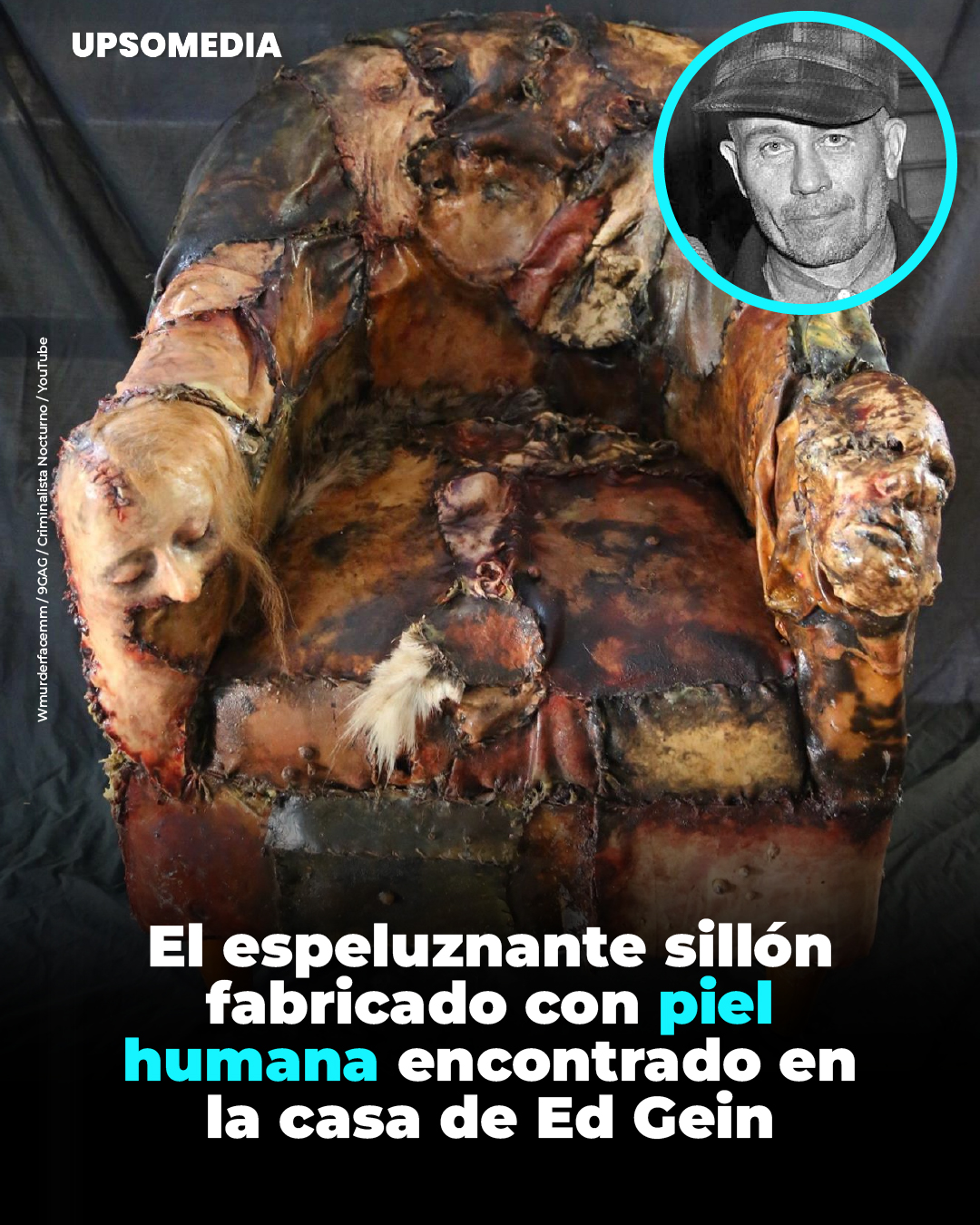 Un joven de 16 años, cuyos padres eran amigos de Gein y que asistían a partidos de béisbol y películas con él, informó que Gein guardaba cabezas reducidas en su casa, que había descrito como reliquias enviadas por un primo que había servido en Filipinas durante la Segunda Guerra Mundial. [ 54 ] Tras una investigación policial, se determinó que se trataba de pieles faciales humanas, cuidadosamente peladas de cadáveres y utilizadas por Gein como máscaras. [ 55 ]