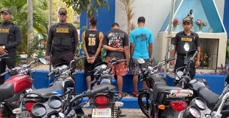 A los detenidos de la banda se les ocuparon varias motocicletas con denuncias de robo / Policía RD.» />