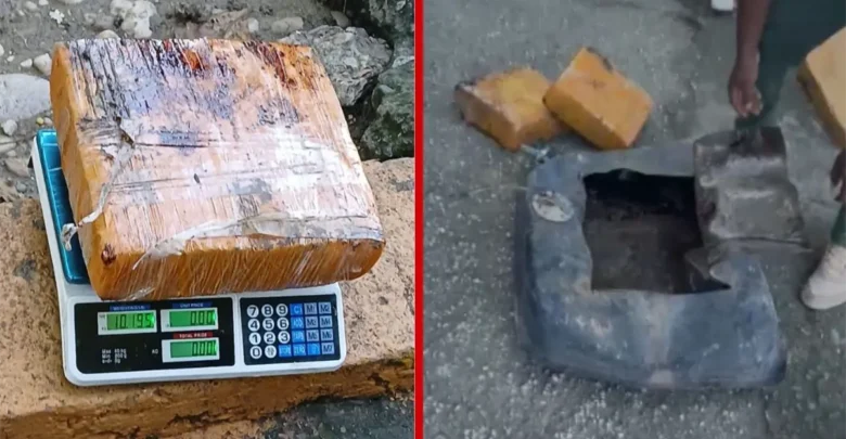 Durante la revisión, encontraron un tanque de combustible adaptado de forma clandestina, dentro del cual fueron encontradas dos pacas de un vegetal de color verde, envueltas en plástico color crema, presumiblemente marihuana, con un peso aproximado de 10.195 y 10.095 libras, para un total de alrededor de 20 libras ocupadas.