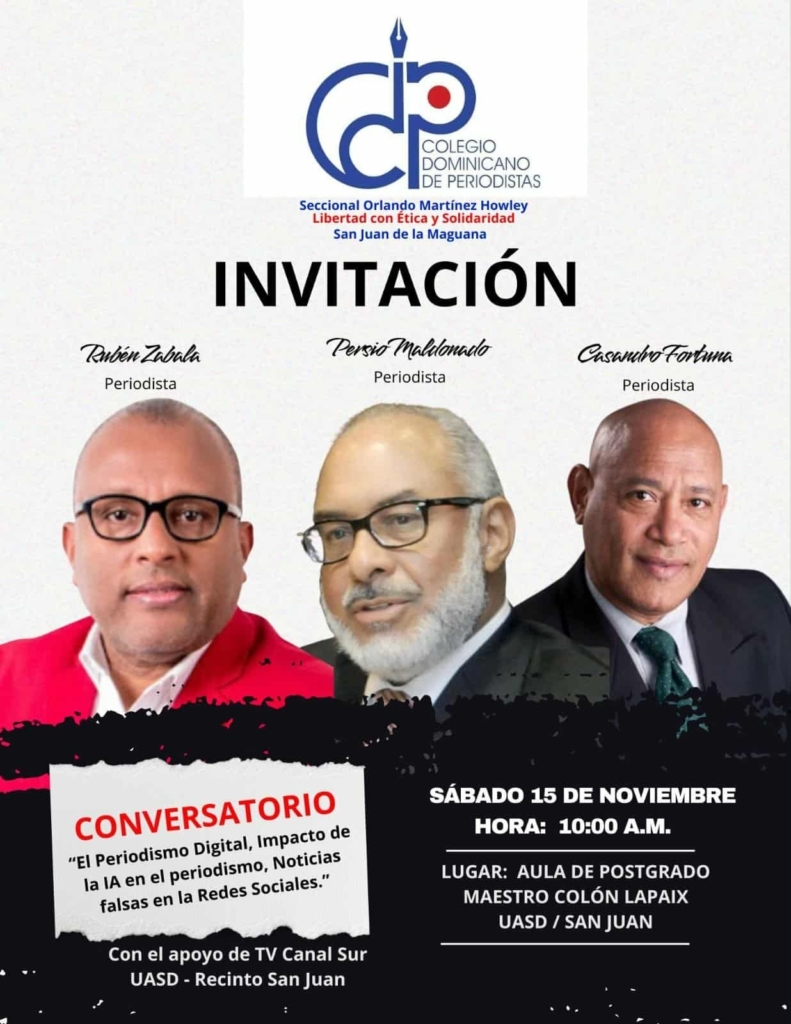 El Colegio Dominicano de Periodistas (CDP) seccional San Juan llevará a cabo hoy un conversatorio con el tema «Periodismo Digital, Impacto de la Inteligencia Artificial en el Periodismo y Noticias Falsas y Redes Sociales».