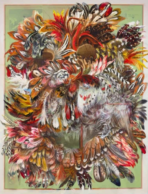 La pieza, una explosión cromática de plumas, gestos pictóricos y referencias cartográficas, forma parte de las investigaciones visuales de Báez sobre los legados coloniales, las diásporas caribeñas y la construcción de identidades en movimiento.