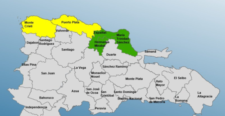 Mientras que María Trinidad Sánchez, Espaillat y Hermanas Mirabal, se encuentran en alerta verde, misma que se coloca cuando las expectativas del fenómeno permiten prever la ocurrencia de un evento de carácter peligroso para la población.