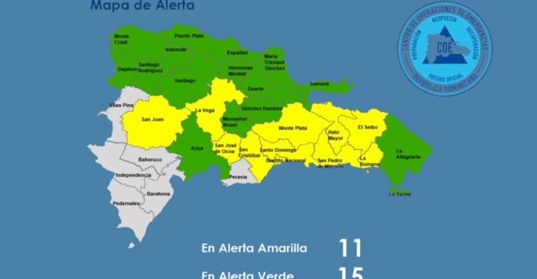 En alerta se encuentran Dajabón, Duarte, Puerto Plata, Espaillat, Azua, Santiago, Santiago Rodríguez y Hermanas Mirabal, mientras que bajo aviso están Samaná, Valverde, La Altagracia, María Trinidad Sánchez, Sánchez Ramírez, Monseñor Nouel, La Vega, San Juan, San José de Ocoa, San Pedro de Macorís, La Romana, Hato Mayor, El Seibo y Monte Plata. No hay provincias descontinuadas.